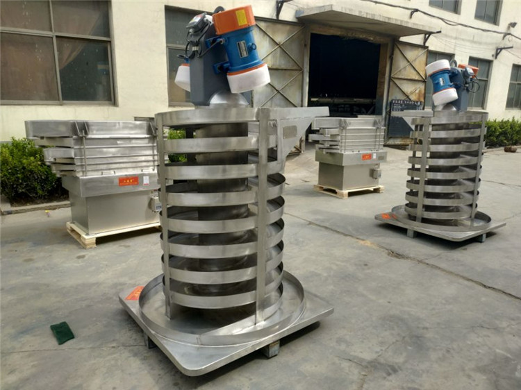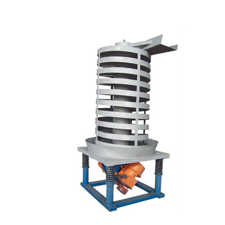 垂直振動輸送機的驅動裝置振動電機安裝在輸送塔下部,兩臺振動電機對稱交叉安裝,輸送塔由管體和焊接在管體周圍的螺旋輸送槽組成,輸送塔座于減振裝置上,減振裝置由底座和隔振彈簧組成。當垂直輸送機工作時,根據雙振動電機自同步原理,由振動電機產生激振力,強迫整個輸送塔體作水平圓運動和向上垂直運動的空間復合振動,螺旋槽內的物料則受輸送槽的作用,作勻速拋擲圓運動,沿輸送槽體向上運動,從而完成物料的向上(或向下)輸送作業。